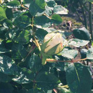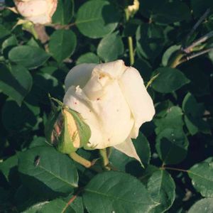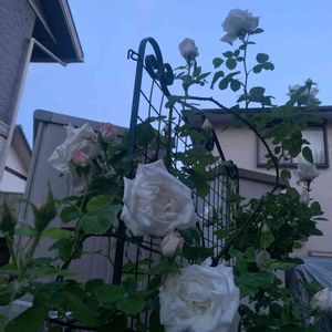 おはようございます☀ 白薔薇の代表格である子、よく観察してみると、淡いクリーム色なんですね🎵 この品種は、一株にたくさんの大輪をつけとても見事なのですが、もう少し引いて撮れなかったのが残念😅