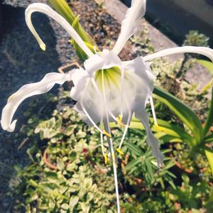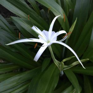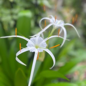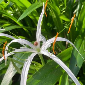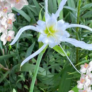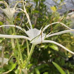 ササガニユリ、スパイダーリリー🤍 高知県立牧野植物園にて。7/21pic。初めまして‼️ 名前は蜘蛛の糸みたいな花の形状だからかな⁉️👍😃