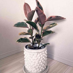 昨日の仕事帰りに、近所のお花屋屋さんからお迎えしました😊✨ お店ではゴムの木とだけ教えていただきました💦 ネットで調べたところ、フィカス エスティカ ルビーかと思うのですが…。 班入りで新芽や茎、若葉が赤いです。 ベリーズとの見分け方が分かりません💦 ご存知の方教えてくださいますか☺️