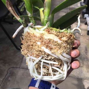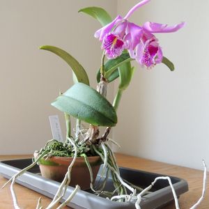 このくらいで色の変化終了ですかね。 左が今日(快晴) 右が昨日(曇り雨) 3枚目は他の植物の中にいる姿。 よく咲いてくれたと思います。 カトレアは他のカトレアも全部コルクに着生させていましたが、根が張って張って成長し、シースーは出るもののなかなか花芽が上がってこないの繰り返し。 そうこうしているうちに、忙しくて以前ほど時間をかけてあげられなくなり、今年の夏前にカトレア全てを水苔で植え替えすることに。 この子は一番根っこが成長していて、3つ目のシースも花芽が上がってこないでいたのですが、どうするか悩んだ末に、結局一番最後に植え替えました。長く伸びに伸びてコルクに張り付いていた根っこのほとんどをカット✂️ そんな状態でしたので、花芽は上がるわけないと思ってたんですよね。 本当によく咲いてくれました🌺