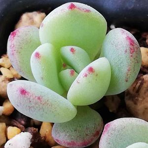 この前の大量の実生苗をドアップで🤳 花の培養土使ったけん土に肥料が混ざってたらしい🙄 ちょっと...緑色。笑 希望としては、赤い縁取りにムッチリ肌🧚