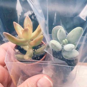 【記録用】ハンズマンで1号鉢をふたつ購入 銘月125円、ふっくら娘100円 ふっくら娘は鉢にも入ってなくて育苗トレーから割り箸でとってビニール袋に入れるスタイルだった😊