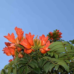 近くの小学校の前にあつたカエンボクです。この木はほぼまんかいでしたが、隣の木は、花が咲いていませんでした。なぜ?
