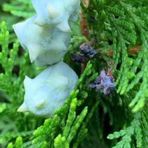 ヒバの実のそばに薄紫の小さなお花のようなものが見えます👀 ヒバだと思っていましたが、コノデガシワなそうです😲 こちらも教えていただきました。