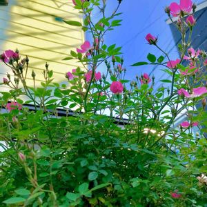 塀の上のミニバラ 開き始めました🌹 去年秋に植え替えしたせいか 大きく育ち♪花もたくさん🎶