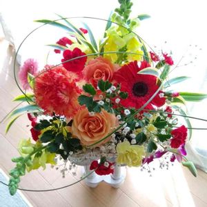 フラワーアレンジメント 昨日、娘からの なんでもない日の お花のプレゼント\(°o°)/ 籠一杯にアレンジしました。 こんな時に嬉しかったです。 鮮やかな色に癒されます。
