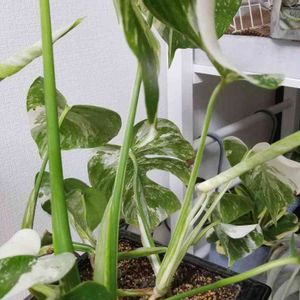 斑入りモンステラ。 もう多肉ばっかでぜーんぜんお久しぶりな観葉植物(;・ε・ ) 葉っぱも増えてきたので、バランスの悪い葉っぱをカットしました✂️✨ めっちゃ乾燥ぎみに育てているせいか、気根がやばいですΣ(・∀・|||)