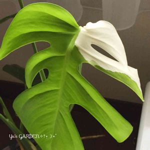 今年はじめての斑入りモンステラの葉っぱ🌱 切れ込みも無いし💦真っ白です😰 これでいいのかなぁ🙄💭 アドバイスお願いします😊