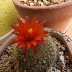 DAISO産ミニサボテンの花が咲きました(o^^o)♪ 蕾の時は赤か限りなく赤に近いローズ色だと思ったのに、開いたら見事にオレンジ(。・о・。)…マミラリアの子かと思ったけど…この子は誰でしょ。。謎は謎のままでも丈夫に育ってるからいっかな(ˊo̶̶̷ᴗo̶̶̷`) (雪晃かな?とも思ってる)