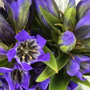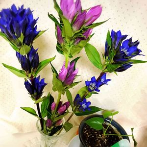アンスリウム(小)と青リンドウ紫リンドウです。 リンドウを部屋に飾りました。 2色のリンドウを一緒に花瓶に飾って思った事。 青が紫色に見えてきて 紫がピンク色に見えてきた👀💦 目の錯覚が発生しました! ずっと見てるとリンドウって可愛いですよ♡