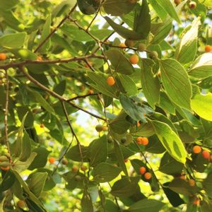 エノキの葉のフチが黄色く紅葉してます🟡 実は赤、オレンジ、黄色😚