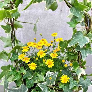 今日も快晴☀️ ビタミンカラーがぴったり✨ 夏仕様にダールベルグデージーとヘデラを寄せてみました🌻