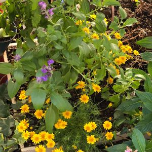 花が少なくなったブルーサルビアの根元にダールベルグデージーを入れました。 庭が明るく元気になりましたよ ╰(*´︶`*)╯♡