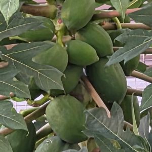 青パパイアの果実🫒 時々稽古帰りに通る道に不思議な大葉に青い果実かなぁ…大きな粒々が調べたらなんとビックリ😵「青パパイア」 一期一会の実🫒でした🤪