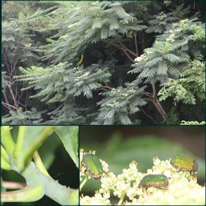 烏山椒(カラスサンショウ) ミカン科 もうすぐ土用の丑ですが、鰻に山椒かける派?かけない派? 烏山椒は畑で栽培される山椒に比べてはるかに大木になります。 山椒と名が付くだけに枝には鋭い棘があり太くなった幹にはイボ状の棘の跡があります。 葉にはミカン科の特徴の油点があり指でシゴくと山椒の葉より甘い香りがします。 若芽は天麩羅で食べられるそうです。 白いお花は高い枝先で咲いていますから香りは分かりません。お食事中のカナブンさんにでも聞いてみたいです。