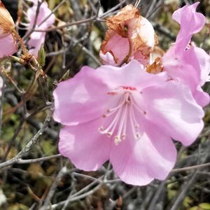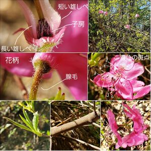 東北に自生するツツジ属は、以下の14種にまとめることができそうです。 ツツジ亜属 ヤマツツジ/コメツツジ/オオコメツツジ ミツバツツジ亜属 トウゴクミツバツツジ/ユキグニミツバツツジ/シロヤシオ レンゲツツジ亜属 レンゲツツジ/アカヤシオ/ムサキヤシオ/オオバツツジ シャクナゲ亜属 アズマシャクナゲ/ハクサンシャクナゲ/キバナシャクナゲ トキワバイカツツジ亜属 バイカツツジ 植栽されたものも多いでしょうから、人里近くでツツジを観察するときは注意が必要かもしれません🤔 「ツツジ属を観察するときのポイント」 ・葉の付き方(互生、輪生) ・若い枝や葉につく毛(扁平、糸状、綿状、腺状鱗片) 雄しべの数やその基部の毛の有無、子房の毛の様子なども手がかりとなりそうですが、箇条書きしたポイントと花の様子だけでも結構しぼることができそうです。 写真のツツジはムラサキヤシオ。 上部の真ん中の花弁に濃色の斑点があり、短い雄しべの基部は有毛で膨らみがあり、長い雄しべの基部は細くほぼ無毛でした。花柄には縮れた腺毛が見られます。雄しべは10個ありました。 メモ ツツジ科 ツツジ属