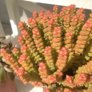 ⏪前のpicより 【クラッスラ属 ポルツラケア (モンストローサ)】 【クラッスラ属 ポルトゥラケア (モンストローサ)】 Crassula portulacea f. monstrosa 別名 ゴーラム・ゴーレム・ 宇宙の木 【クラッスラ属 オバータ ゴーラム】 Crassula ovata ‘Gollum’ 別名 ゴーラム・ゴーレム・ 宇宙の木 気根が出てきていたので、 前のpicのゴーラムをカット✂️ 足元には👶も転がっていました 【ゴーラム】の学名を調べてたら、 C. portulacea f. monstrosaとの事 モンストローサとあるので、 どうやらゴーラムは 【カネノナルキ(金のなる木)】 の枝変わり品種らしいです💰 そう言えば、矢印のようにいくつか 筒状になってない葉がありました 先祖帰りしたのかな?(*‘ω‘ *) 「葉は棒状で先端がお皿のように凹んでおり、その周りが赤く縁取られる 葉の表面にはワックスを塗ったような光沢が この面白い葉姿は、紙をくるりと巻くと筒状になるように、葉の左と右端がくっついて棒状になったもの 生長すると下の方の葉が落ちて茎の表面が木のようにごつごつとなり、上の方に棒状の葉が茂った「SFチックな低木」みたいな姿になる 南アフリカ原産、耐寒性はやや弱い 花は淡いピンク」 【ヤサシイエンゲイ】から抜粋 http://www.yasashi.info/ko_00023