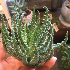 教えて頂き、名前がわかりました❗ この子は帝王錦さんです。 ~~~~~~~~~~~~~~~~ 名前が分かりません❗ 家に来て3ヶ月のダイソーの多肉さん。多分アロエ…? 青白い肌にサイズにしては大きめの白いトゲ。 柔らかい体でトゲを触っても痛くないです。 子の方が誰なのか、分かる方がいらっしゃいましたらよろしくお願いします🙇⤵