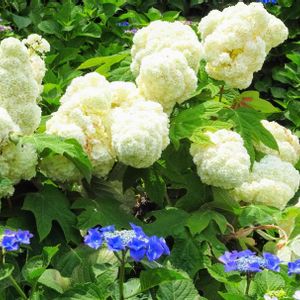 カシワバアジサイ(柏葉紫陽花) こんなにボリュームがあるモコモコのアジサイを、この時初めて観ました。 手前の普通のアジサイと比べると、驚きです👀🎶。 (幸手権現堂堤)
