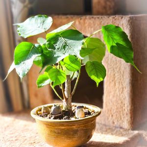 フィカス レリジオーサ インドボダイジュ 盆栽仕立ての方のボダイジュ。 古葉は全部落として新葉だけに。 葉っぱが大きく混んできて傘のように幹を守っています。