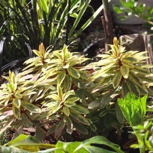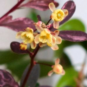 メギ(斑入り・銅葉)開花 新しく伸びた枝が美しい斑入り銅葉。 今年は、花も多く咲いた。新しい斑入り銅葉を花後剪定するのは、例年より時期が遅い気がする。