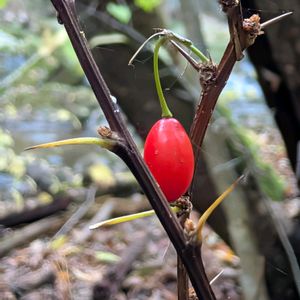 メギ(目木) メギ科メギ属の落葉低木 別名 コトリトマラズ(小鳥止まらず) 分布 本州、四国、九州 水がチョロチョロ流れる傍に生えていました。 赤い実は、数えるくらいしか、 ついていませんでしたが、 ヘラ形の葉が数枚ずつ束になっているのが独特で、 鋭いトゲがあって、 確かに、小鳥🐦が止まらないかも🙄と思いました。