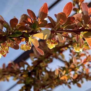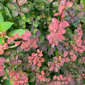 今日の仕事先の植物 ググると「メギ」とでましたが、、 拡大🔍すると、くすんだ緑の丸葉から 紅い枝と葉がビョンビョン伸びています。 なんか不思議なキ、、