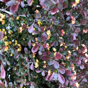 [回答] メギと教えていただきました。 メギ、女の木と書くのですかね?調べてみます☺️ →目木でした。 補足→アカバメギでは?とご指摘いただきました。 タグ付けに追加しておきます。 ありがとうございます☺️ 【名前を教えてください】 紫色の葉っぱに 黄色の花 葉っぱは「オキザリス」に 花は「ヒイラギナンテン」に 似てるように感じます。 名前を教えてください🙇