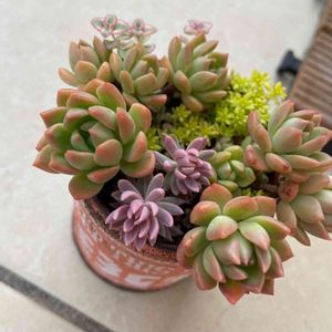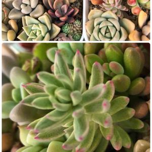 皆さんのpic見てて… 急いで多肉棚で💦 🏷牛の日🐄 🏷錦の日🍀に参加しま〜す🙋♀️ カメレオン錦サクラ鉢に植えました🌸 愛染錦2つ目💓 ジーンズ鉢の桃香錦(ピーチプリデ錦)