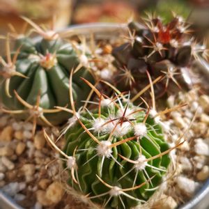 いっこ200円のおチビさんたち🦔🦔🦔 植替え待ちです。 コロコロして可愛いのぉ〜 左:エキノフォスロカクタス(ステノカクタス) ??? 中:フェロカクタス 日の出丸 右:??? トゲトゲ波波🌊🌊🌊