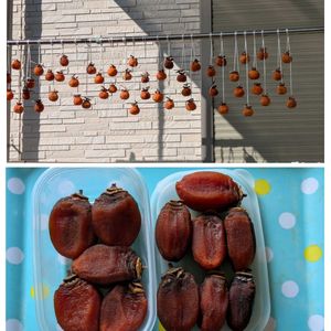 おはようございます😃 今日のお庭から♥ 吊るし柿❤️ ご近所さんの軒下に吊り下がっている冬の風物詩を羨ましく見ていましたら、古い友人から、お手間入りの出来立てを送ってきました。美味し〜い💞、嬉し~い💞