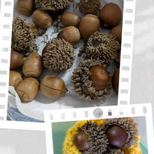 おはようございます😃 今朝は☔。 今日のpicはどんぐり。 帽子をかぶったままの 可愛い佇まい。 誰かが毛糸で籠を編んで どんぐりを入れてくれた。 暖かそうです😊