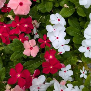 おはようございます😃 今日のお庭から🧡 ニチニチソウ🧡 3色揃い咲き🧡 ご近所さんシリーズ