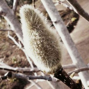 辛夷(コブシ) モクレン科モクレン属の落葉高木。山地や里山に自生する。街路樹や公園樹、庭木として植えられるものは中国原産の仲間のこともあり、自生のものより花が大きい。白木蓮(ハクモクレン)と同様に、銀色の毛に包まれた冬芽が目立ち、染井吉野(ソメイヨシノ)に先駆けて花が咲く。花期は3~4月。葉を開く前に花をつけるので、満開になると木全体が白く見える。花弁は6枚、萼片は3枚で、1〜2枚の小さな葉を従える。モクレン科の花は中心に多数の雌しべがあり、その外側に多数の雄しべが囲む。花が終わると雌しべの集合が育つが、受粉した雌しべだけが膨らむため、ごつごつとしたいびつな集合果になる。秋に熟すと集合果は裂け、糸状の珠柄の導管で赤い種子をぶら下げる。種子は赤い外層、白い油脂の中層、黒いハート形の内層がある。蕾は日の当たり方で発達が異なり、日の当たる南側がよく発達すると、先が北向きになる。 よく似た田虫葉(タムシバ)は花の下に葉がつかないが、本種は小さな葉が1〜2枚つくので区別できる。 集合果が握りこぶしに似ているとこが名前の由来。蕾の形も握りこぶしに似ているため、そちらが語源という説もある。北国ではこの花を目印に農作業を始めるため、『田打ち桜』『種まき桜』『芋植え花』など農業にまつわる別名を持つ。辛夷と書くが、中国の別の植物の名前を誤用したもの。 出典『葉っぱで見わけ五感で楽しむ樹木図鑑』『草木の種子と果実』『里山の花木 ハンドブック』『樹木の名前』『薬草の呟き』
