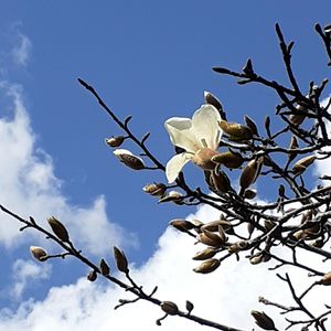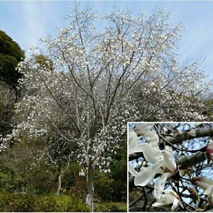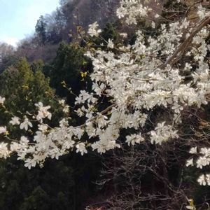 穏やかな日になりそうです 白いお花が咲いています 辛夷 コブシ モクレン科 お花はモクレンよりも小さめです