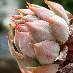直径 7.5㎝ほどの、多肉ゴンドラの上の部分をアップで 爪が赤くなってきた メビナとティッピーが可愛いです❤️