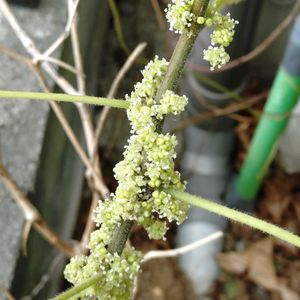 こんばんは🌃 ①オカワカメ 3年目にして、白い小さな花が咲きました🙌 ②③④柿 センニンソウは白い花が枯れ、柿の木に絡まっています😊 今年は生り年なんでしょうか?🤔 たわわに生っています〜🎵 (よそ様の柿)