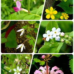 🌿💚🤍💛💗草花💗💛🤍💚🌿 左⬆️ カラスのエンドウ 左↕️ ヒメウズ 左⬇️ ネバリノミノツヅリ 右⬆️ ヘビイチゴ 右↕️ キュウリグサ 右⬇️ オドリコソウ 畑の小さな小さな草花達🎶😊🤗🥰