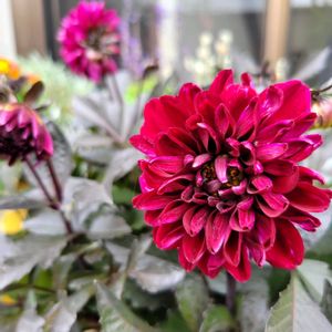 レディーダリア アルナ ダークリーフ❣️ こんな美人さんに😍 真っ赤で花芯の方が少し深い赤😃 手前の開きかけのコは俯いていますが、 咲いてくると、シャキーン!˚✧₊⁎❝᷀ົཽ≀ˍ̮ ❝᷀ົཽ⁎⁺˳✧༚✨💖 私を見て‼️と目が合いますよ、笑😄