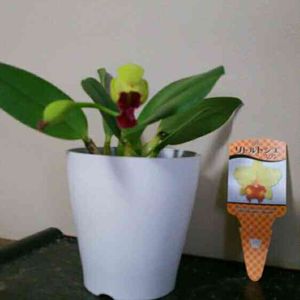 Cattleya cernua, aurea strain 万花園さんオータムフェア 2号鉢に可愛らしい葉が6枚 黄色の花を待ちます。
