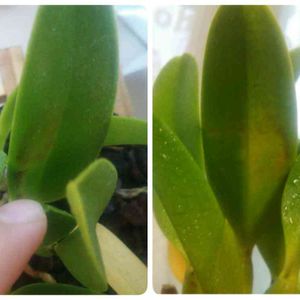 相談です<(_ _)> 数日前からミニカトレアの葉の裏の一部が黄色くなって凹んで、同じところの表は凹凸はないのですが少し黒くなっていて、、 このような症状が出ているのはこの葉ともう1枚あり、もう1枚の方の葉は、裏が凹んで黄色くなっているだけで、葉の表はなんともありませんでした。 日に日に症状が進んでいるといった様子ではないです。 この症状が発生する前、ちょうど、日差しが弱いかなと思ってレースカーテンを外した窓ガラス越しの直射日光に当ててみたり、風通しが悪そうだったので窓を開けてみたりしたので(その時部屋の中は14℃くらいで、外は1桁だったと思います😣)、もしかしたら環境をコロコロ変えたのが原因なのかもと考えましたが、、 何しろ洋ランは初めてで右も左もわからず... どのように対処したらいいかわかる方いらっしゃったら教えてください🙇🙇 普段の栽培場所は、2階の自室の南向きの出窓で、つい最近買ったばかりなので春を待った方がいいかと思いまだ植え替えはしておらず、買った時のまま黒いビニールポットで小さいバークに植えられています。 灌水は鉢の中まで乾いてからで、湿度が40~60%と低いので朝夕葉に霧吹きをしています。 暖かい日は夕方でも19℃くらいあり、寒い日だと15℃くらいです。朝方がもっと寒いので、夜中は出窓から離して机の上においています。 まだ温度が1桁になったことはないです。関東住みです。 この症状が何かわかる方教えてください🙏 よろしくお願いします<(_ _)>