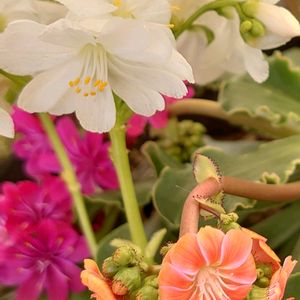 レウィシアのお花がたくさん咲いてます🌸 咲き始めと咲き終わりは淡いサーモンピンクのような色で 満開時はクリーム色の優しい色の花 高山植物ってことで、まだ外で頑張ってます😂 温室も室内も満員御礼💦笑
