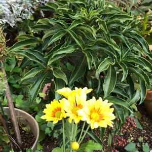 昨年、さし芽をした 中輪咲き 黄色の菊 中心に紅色
