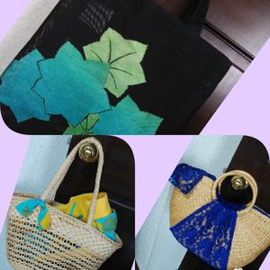 🎐葉っぱが🍀美しい 夏帯のトートバック 帯地ですので確りしていて 型崩れが無いです (透けています)💼 🎐籠バック(左) トロピカルな布でバック.イン.バックと🎀リボンを付けました💼 🎐籠バック(右) ストールのレースを使用し内側に同色の裏布を付け、レースのカバーを付けたので使い勝手が良く安心です💼