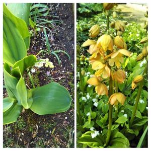 今日のお庭🍃 みんな まだまだ これから〜😃 おっきくなぁれ👍👍 右上 オダマキ💜 左上 キンセンカ🌼 中央 ギボウシ🍃 右下 スズラン🤍 左下 キリンソウ🌼