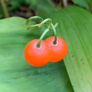 さくらんぼ🍒めしあがれ✨ ……食べたら病院🏥行きかもね(⃔ *`꒳´* )⃔↝ しれっとしたオレンジのこの実は、スズラン🌸 仕事いってきまーす≡┏( `Д´)┛