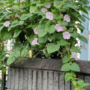 西洋朝顔がキレイです(∩´∀`∩)💕 夏の間、庭仕事をサボった為に、つる性植物が我が物顔で庭中を這い回っています💦 ツルニチソウ、ヤブガラシ、へクソカズラ アケビ、アイビー、etc. 厄介なのがアイビーと西洋朝顔😵 アイビーはブロック塀に張り付いて取れない❗ 西洋朝顔は、旺盛な生育力でビックリする所へ蔓を伸ばして咲いています💦 綺麗なんですけどねぇ😓 今年は、ツルバラのフェンスと紫陽花コーナーを覆い尽くして、気がつけば日陰になってしまい、危ないところでした😵 可愛そうですが、刈り取り作業開始です😅