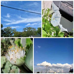 今朝も西洋朝顔が咲いてました。 午後も⁉︎ マユハケオモトもつぶつぶ? 本当ハケみたいだね❣️ 小さいに当てはまらないかなぁ😅 朝のうちは秋の雲だったけど、午後はまるで夏雲もくもく☁️ まだ台風の影響じゃないよね?