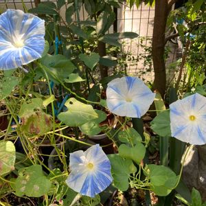 最近咲いている朝顔 ↗白色は(日本朝顔)もう咲いていません。 他の西洋朝顔は短日植物(日照時間が短くなると咲く)なので まだまだ咲きそうです😃 ↖フライングソーサーは 今年初めて知りました。 もっと色んな柄が出るといいなぁ♡💙 ↙↘どちらのブルーも大好きです💙