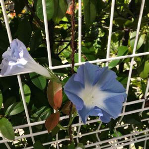 我が家のこぼれ種組の西洋朝顔、名前は忘れましたがもう5年位毎年楽しませて😃🎶くれてます👍 猛暑の中でも元気すぎて、バラロココさんに同居というか寄生というか・・・💦💦 共生出来ると良いのですが😅。。。